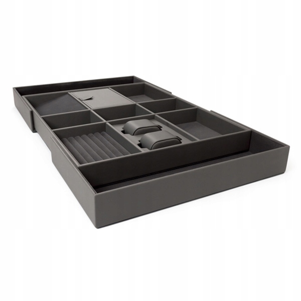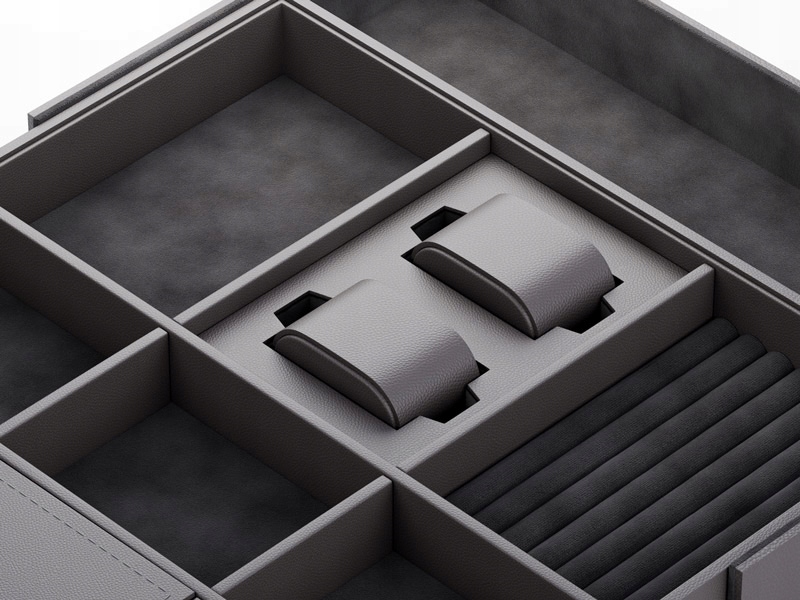 ✅ Wyposażony jest w przegrody, schowek, miejsca na zegarek oraz rolki np. na pierścionki.