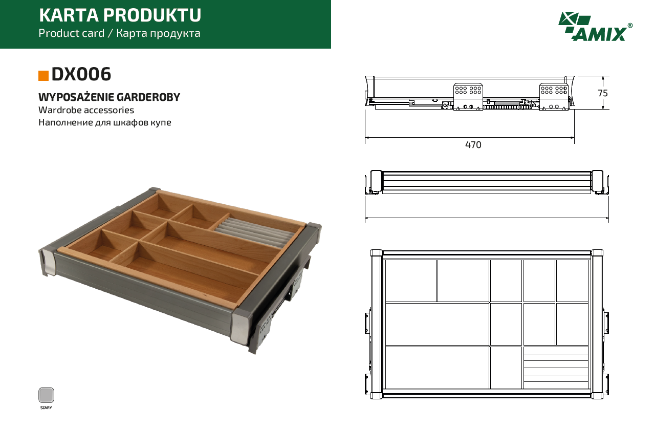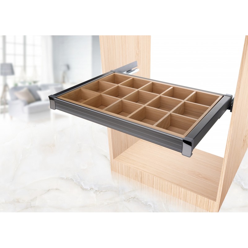 - wysokiej jakości wysuwana półka z przegrodami montowana do boków szafy/wnęki