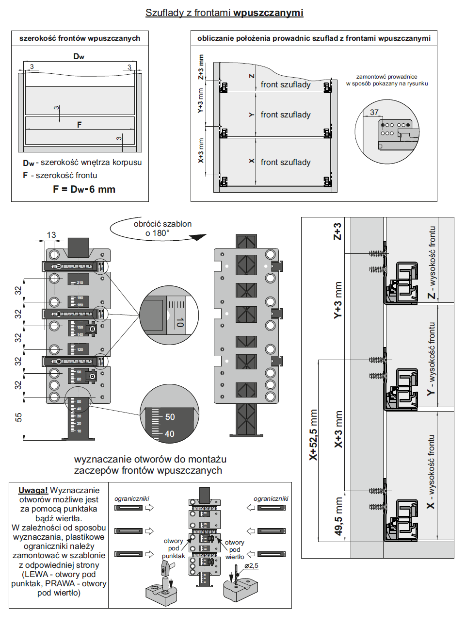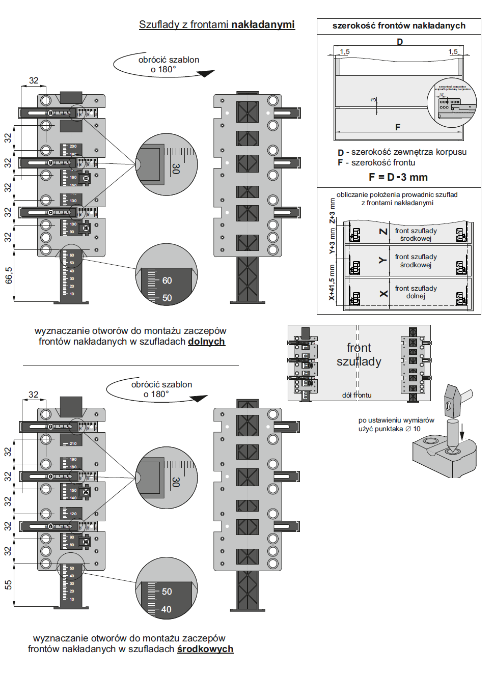Szablon przeznaczony jest do najpopularniejszych systemów szufladowych, ale także do innych mniej standardowych układów. Wzornik został wykonany z tworzywa i stali, więc można go z łatwością przechowywać, transportować i użytkować nie martwiąc się o uszkodzenia.
